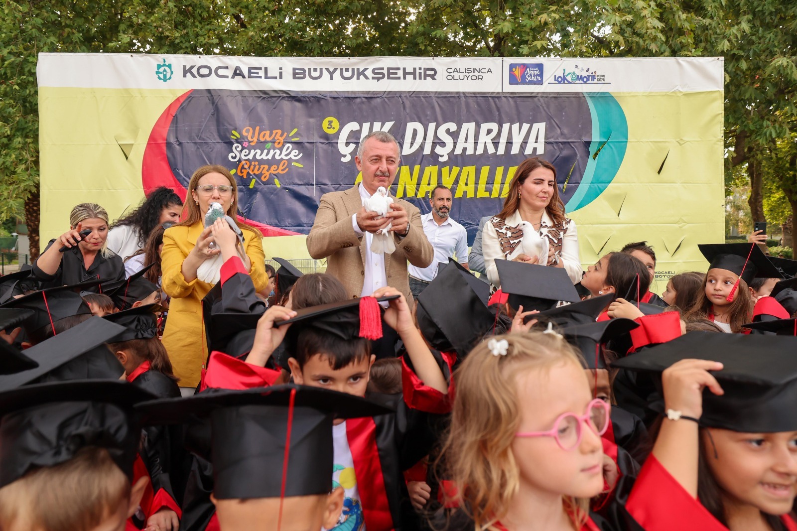 Kocaeli Büyükşehir Belediyesi Kadın ve Aile Hizmetleri Dairesi Başkanlığı’na bağlı Çocuk Hizmetleri Şube Müdürlüğü bünyesinde İzmit Doğukışla Parkı’nda kurulan Lokomotif Çocuk Köyü’nde mezuniyet heyecanı yaşandı. Bu kapsamda çocuklar için Doğu Kışla Parkı içerisine oyun alanları ve atölyeler kuruldu. Çocuklar, mezuniyet töreni öncesinde aileleriyle birlikte etkinlik alanına gelerek, gün boyu çeşitli oyunlar ve atölye çalışmalarıyla keyifli vakit geçirdi.