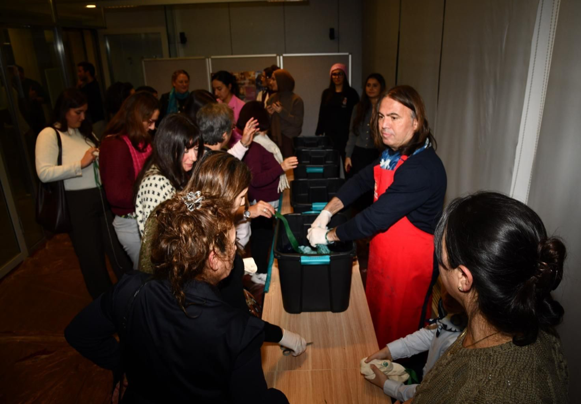 Son bölümde ise Prof. Dr. Mustafa Genç, katılımcılar ile birlikte kökboyama atölyesi gerçekleştirdi. Etkinliklere katılanlar bez çantalarını doğal boyama yöntemi ile renklendirdiler.