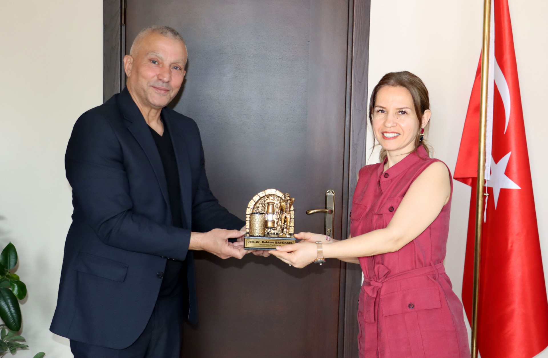 Demir, ziyaret anısına Dr. Altuntaş ve Dr. Eryüksel’e madenci heykeli takdim etti.
