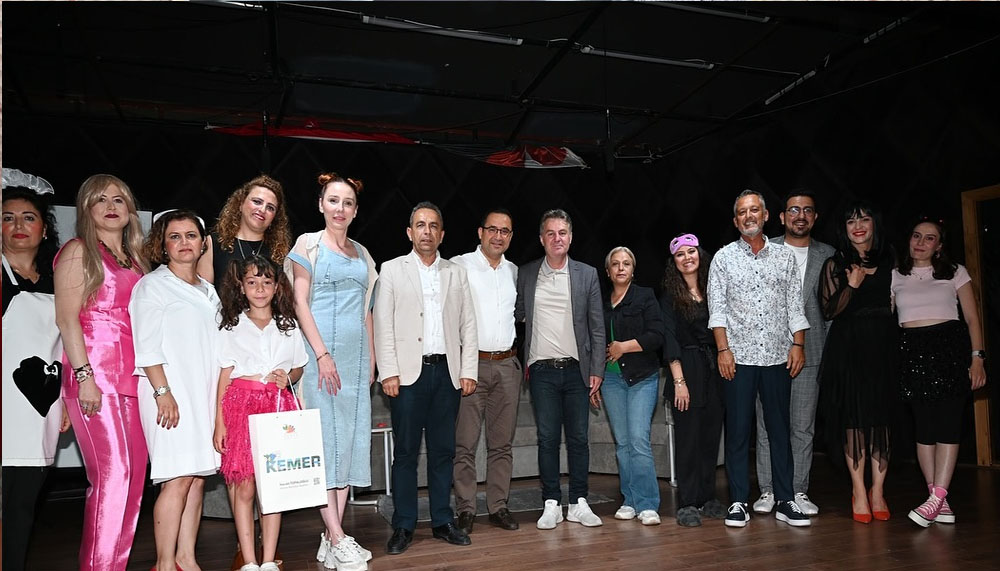 Tiyatro oyunu sonrası Belediye Başkan Yardımcı Baytekin, öğretmenlere Kemer kolonyası vererek hatıra fotoğrafı çektirdi.