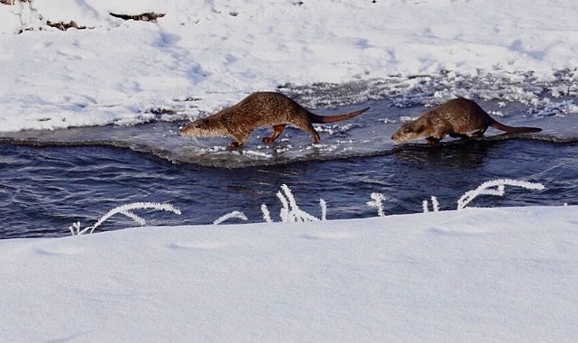 Nesli tükenmekte olan su samuru buz üzerinde balık avlarken görüntülendi
