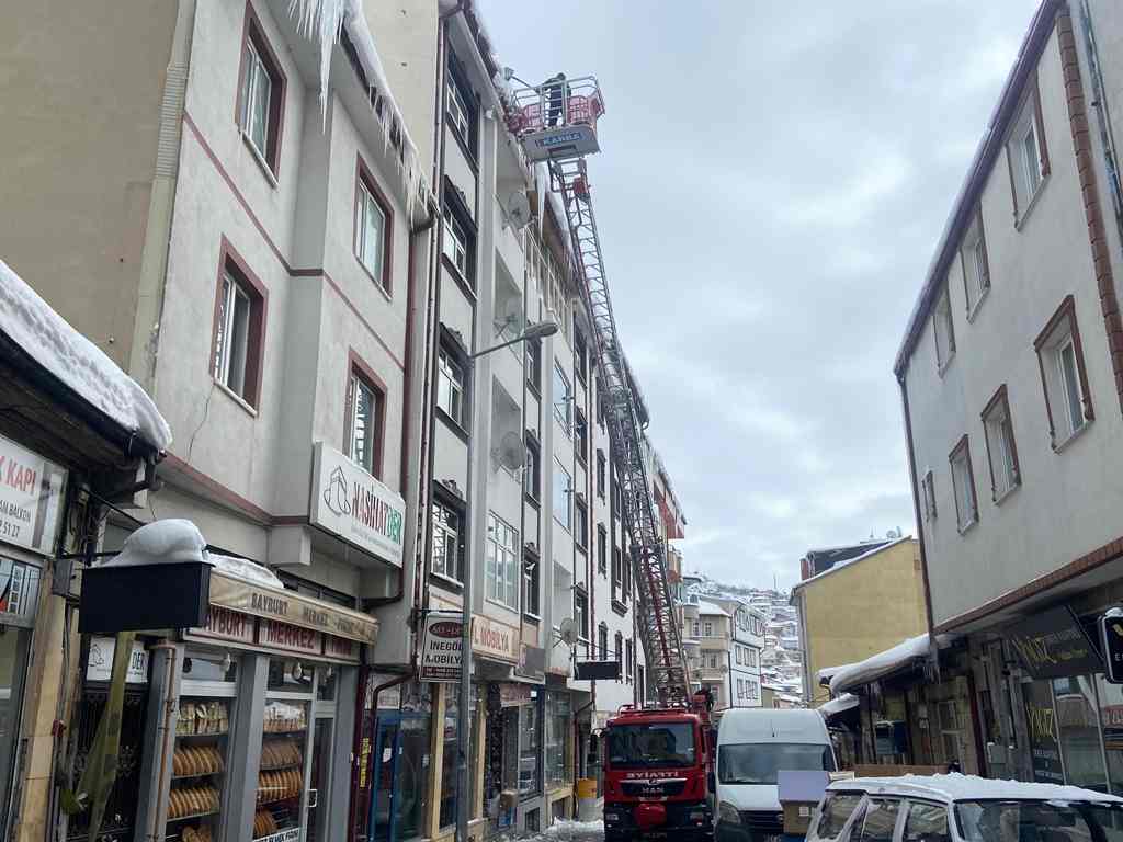 Bayburt Belediyesi İtfaiye ve Zabıta ekipleri, saçaklardan sarkıtları düşürmek için çalışma
