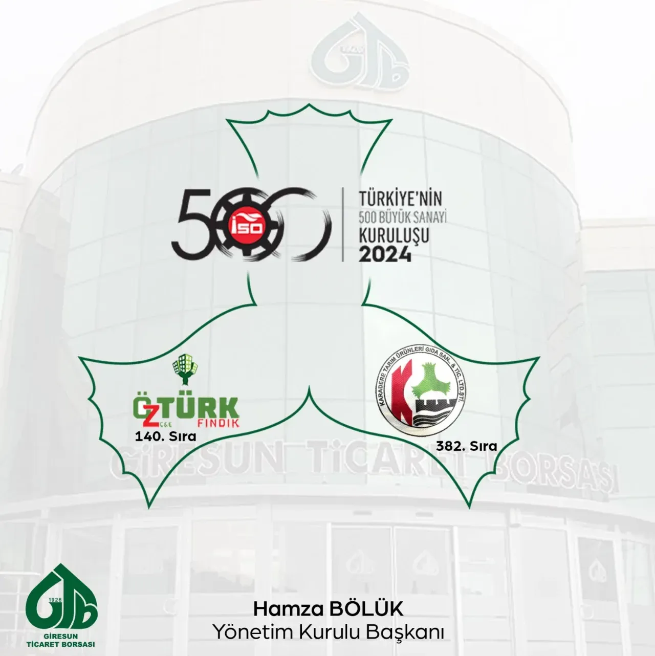 ISO ikinci 500 büyük sanayi kuruluşu-2024 araştırmasında Öztürk Fındık ve Karadere Tarım Ürünleri firmaları listeye adlarını yazdırdı.
