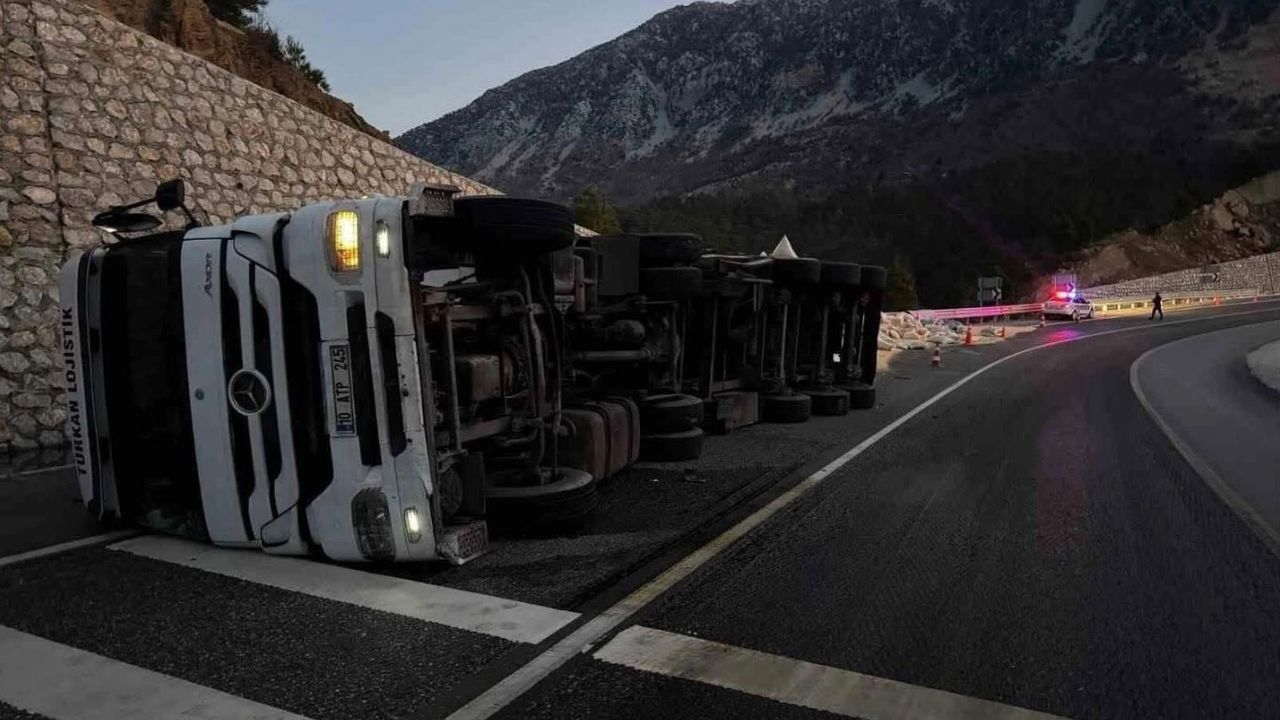 Antalya-Konya D-687 Karayolu Demirkapı Tüneli girişinde meydana gelen trafik kazasında yem yüklü bir tır devrildi, 2 kişi yaralandı.