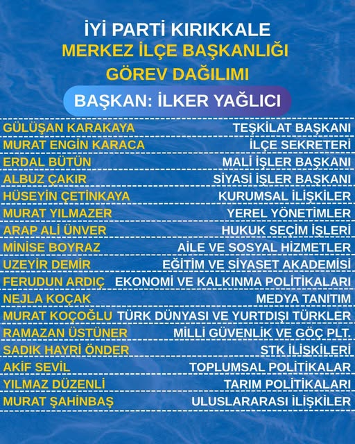 İYİ Parti Kırıkkale Merkez İlçe Başkanlığı, yeni yönetim kadrosunu belirleyerek görev dağılımını kamuoyuyla paylaştı. İlçe Başkanlığı görevini İlker Yağlıcı’nın üstlendiği yeni yapı, liyakatli, çalışkan ve çözüm odaklı isimlerden oluşturuldu.